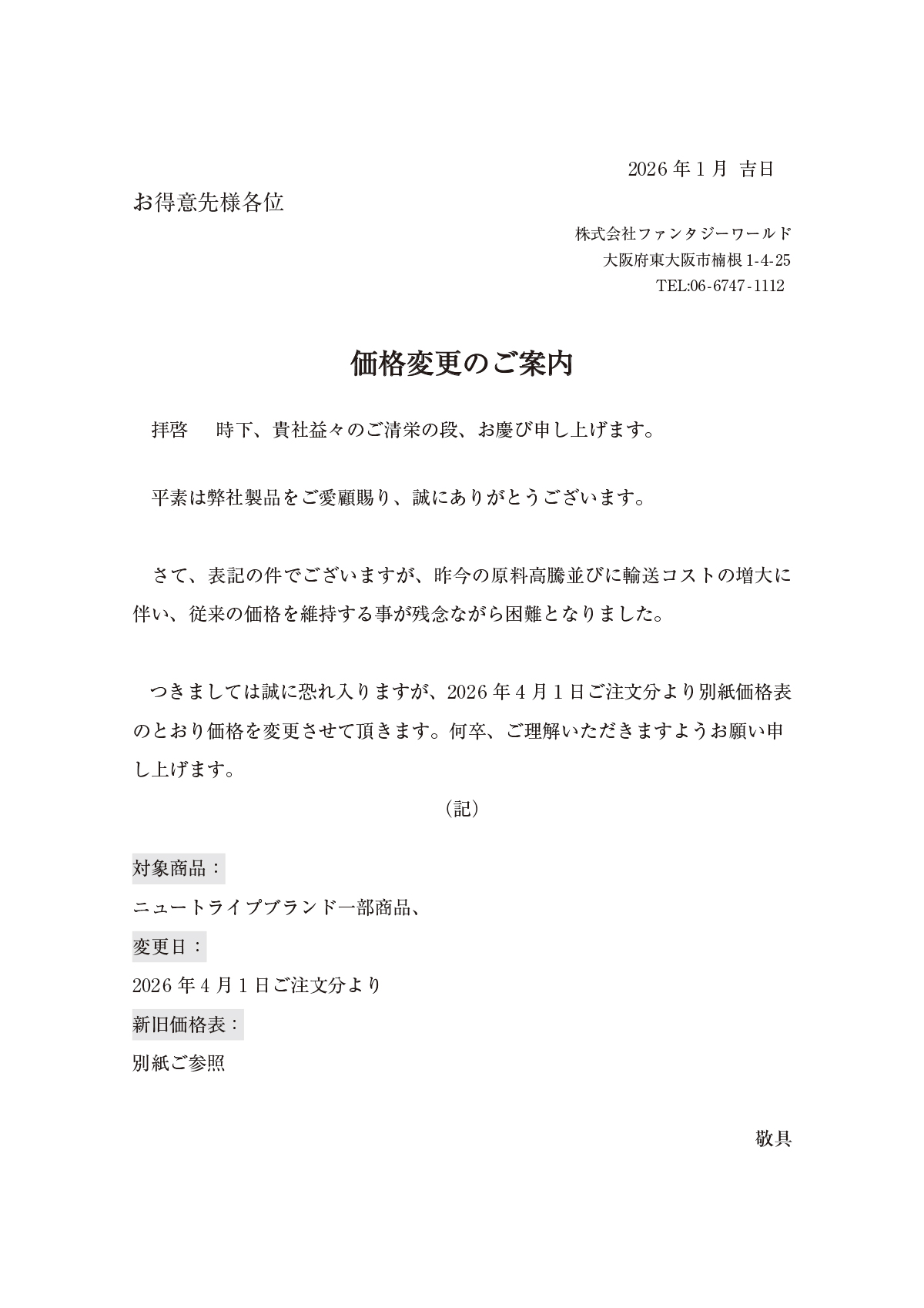 お客様にご愛用いただいております ニュートライプ ドック缶各種 につき、販売元より価格改定のお知らせが届いております。