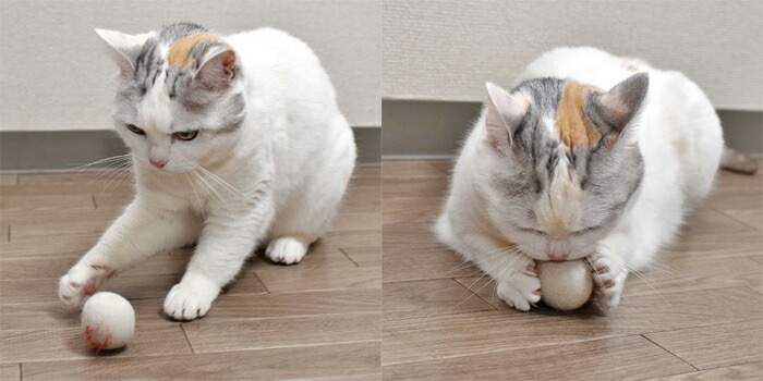 ニャンコがくわえたりコロコロ転がしたりしやすいサイズです。