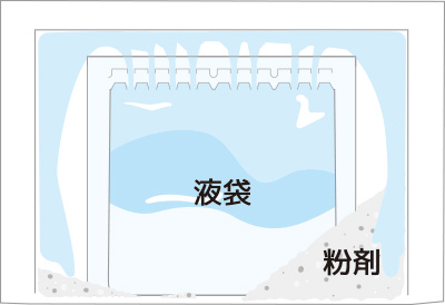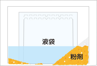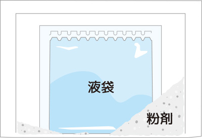 パウチを振りながらもみほぐし、液剤と粉剤をよく混ぜます(液剤と粉剤が均一に広がっていなくても効果に影響はありません)。