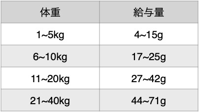 ・上記の給与量を目安に愛犬の大きさ、健康状態、年齢、運動量などを考慮して1日2回から3回に分けてお与えください。